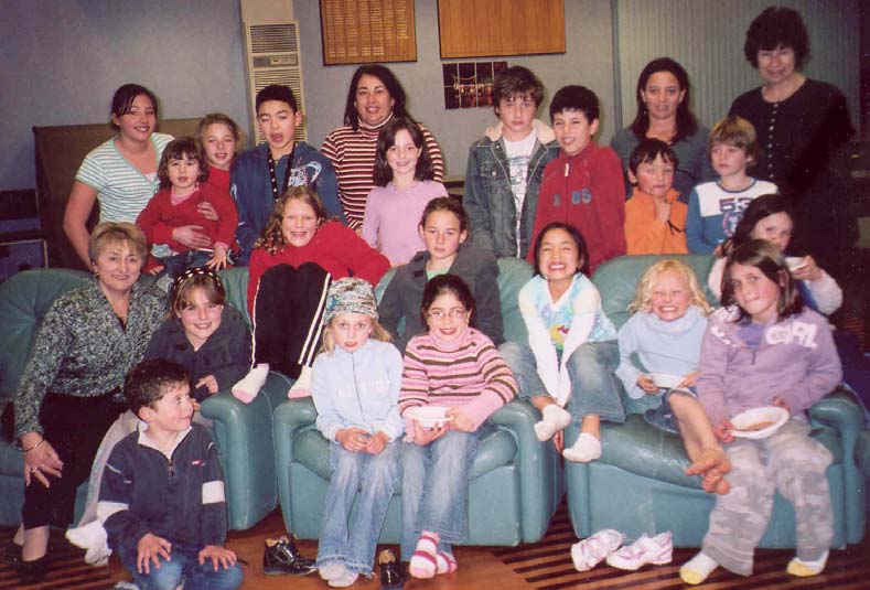 A happy group of children at the Kids Movie Night, with Jo, Maria, Lisa and Ginette